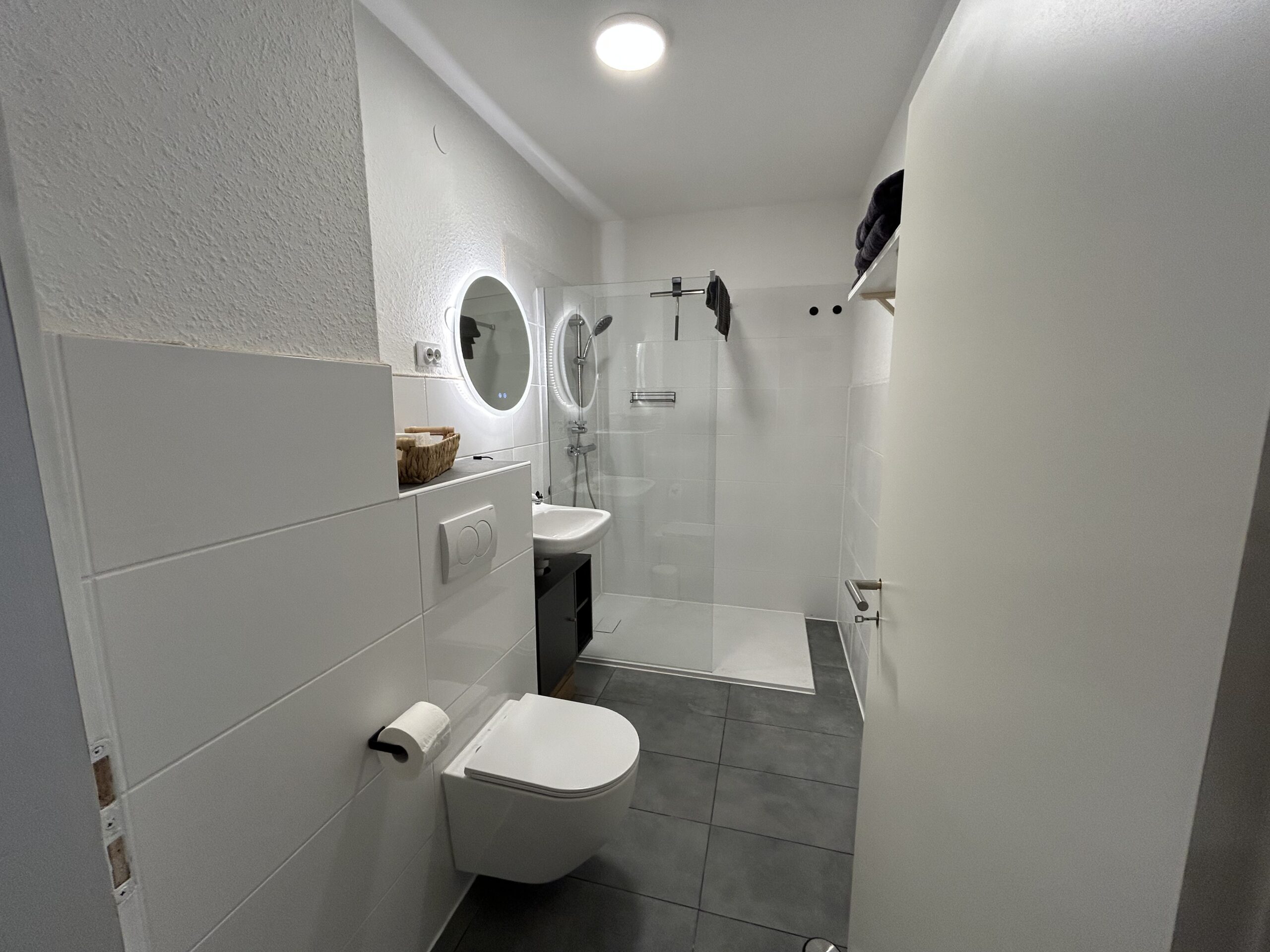 Das frisch renovierte Bad punktet mit ebenerdiger Dusche, heller Gestaltung und hochwertiger Ausstattung – ideal, um entspannt in den Tag zu starten oder nach dem Strandbesuch aufzuwärmen.