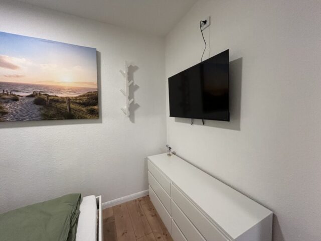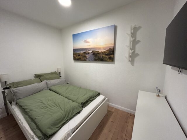 Im Schlafzimmer erwartet dich ein gemütliches Doppelbett (140 × 200 cm) und ein eigener Smart-TV – ideal für ruhige Abende und erholsamen Schlaf nach einem Tag am Meer.